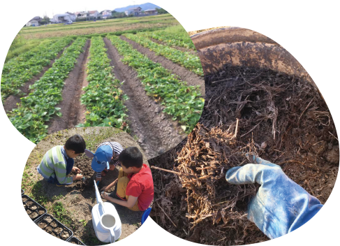 農薬や化学肥料は使わずに、主に畑の草を根っこごと抜いて、米ぬかをふって発酵させて 、自家製雑草肥料にしています。もみがらやくん炭なども堆肥にして土づくりをしています。