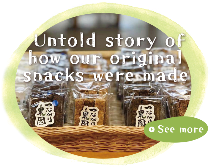 They are “hard” and crunchy! They are made from uncooked soybean curd byproducts from a tofu shop in town and rice powder from Komekko Kobo in Komatsushima. These snacks are very popular with young children and people with allergies.