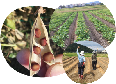 We love beans! Because we like them so much, we ended up growing many kinds of beans as well as soybeans. Especially red beans are well used in mame daifuku mochi cake and anmitsu, sweet bean agar-agar with fruits. Soybeans are made into powder, tofu, soy milk, natto, soy sauce, miso, tofu extract byprodacts, and so on and on.