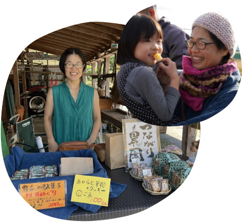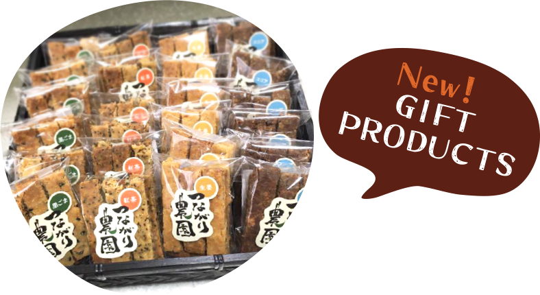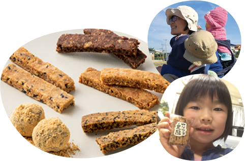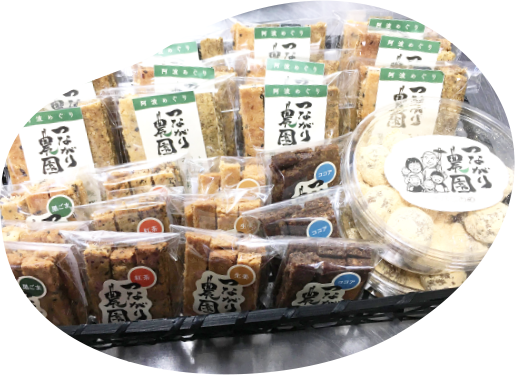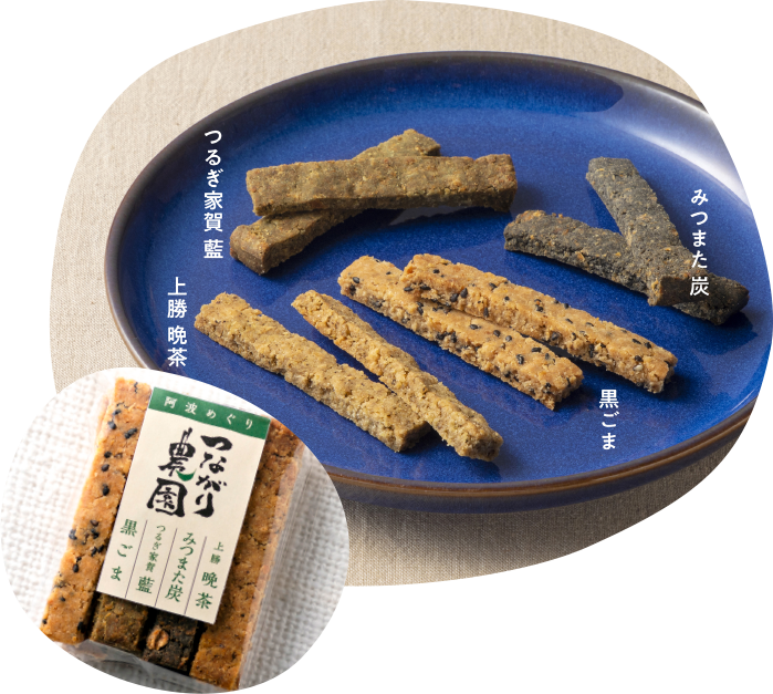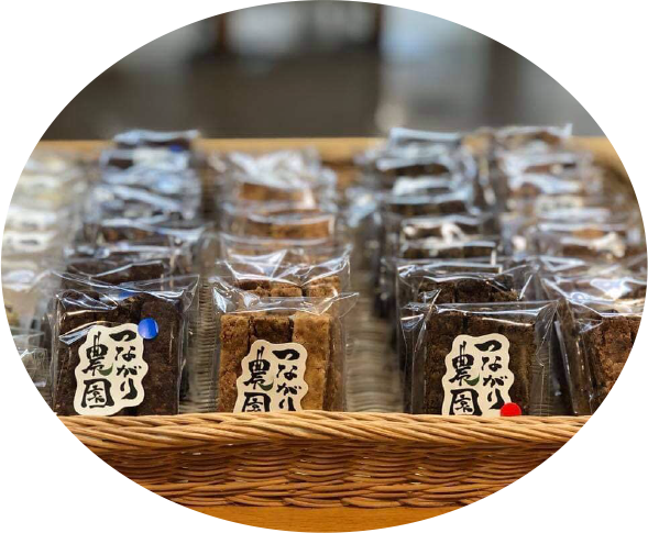 "Awa Meguri" are the snacks Farm Mom made with tofu extract byproducts and rice powder from Awa Region. These slowly baked hard cookies are crunchy and you can taste the ingredient's natural sweetness and flavor as you chew, which leads you to want more and more.